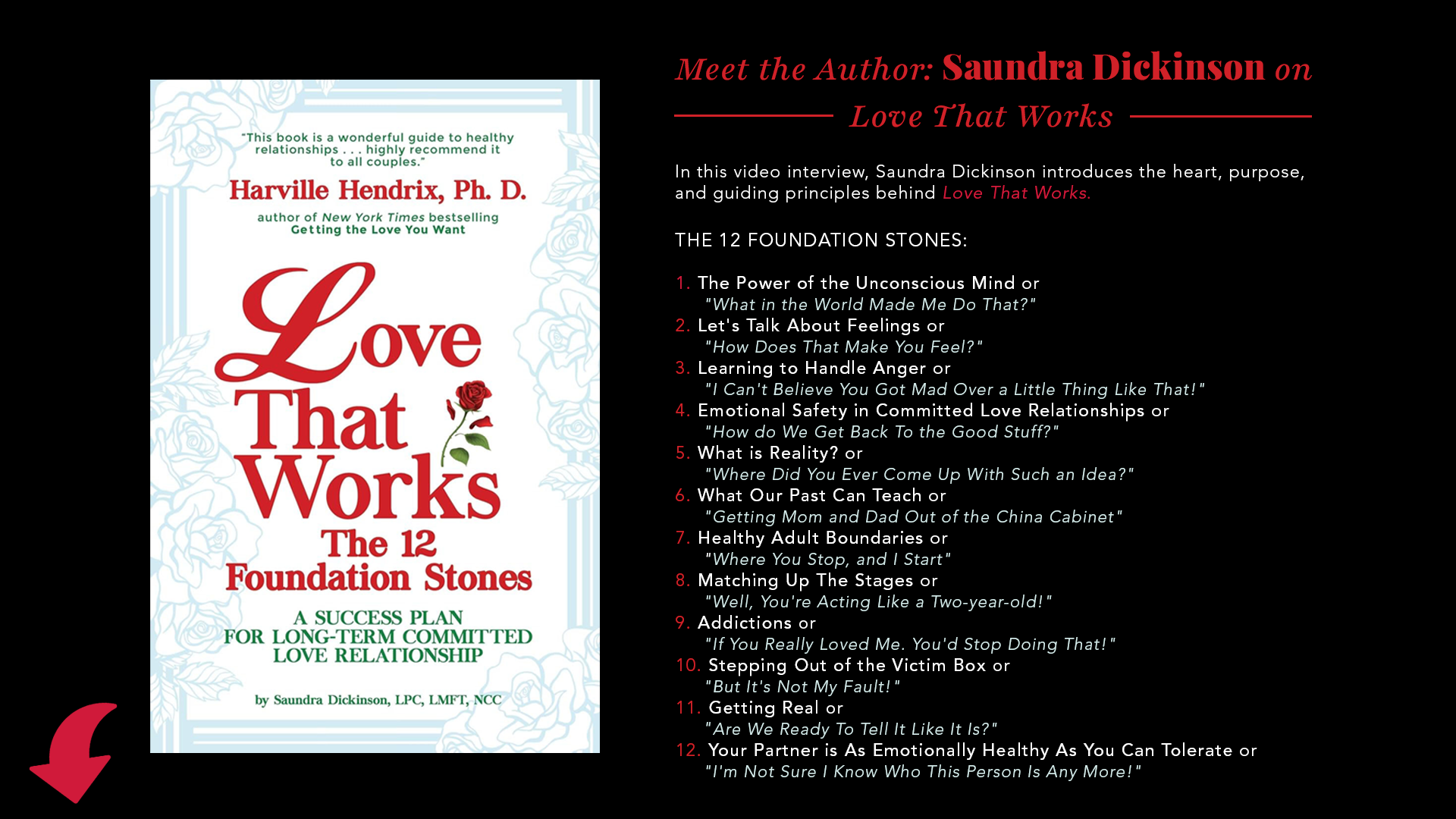 Saundra Dickinson is a Certified IMAGO Relationship Therapist, Certified IMAGO Workshop Presenter, Certified EMDR Therapist, LPC, LMFT, NCC. She specializes in all areas of human relationships including couples, families and individuals. Saundra has been trained and mentored by many who have become the best in their fields, to name a few: Harville Hendrix & Helen LaKelly Hunt who pioneered IMAGO Relationship Therapy and that is now known and used worldwide as the Gold Standard for all relationships, Pia Mellody for her Addiction, Codependence and Inner Child work, Terry Real for his Relationship Rescue work, and countless EMDR trainers who have turned the light on with trauma so that it does not become a debilitating disease that permanently stifles one’s life. Her book about relationships, Love That Works: The 12 Foundation Stones, is available in all bookstores and online.